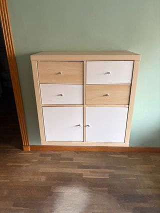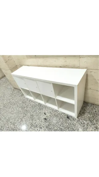 Estantería modular Kallax de Ikea, versátil y práctica. La combinación incluye 4 cajones y 2 puertas para un almacenamiento flexible. Está en perfecto estado. Nueva esa combinación vale 105 euros.