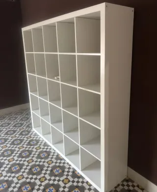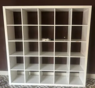 Estantería modular Kallax de gran tamaño, ideal para organizar libros y objetos. - Medidas: 184.5 x 184.5 cm. - Acabado en color wengue. - 5 x 5 huecos (25 espacios 33.5x33.5) NO SE ENVÍA. SE ENTREGA DESARMADA PARA FACILITAR EL TRANSPORTE Empaquetada en 2 bultos, perfecta para transportar. Posibilidad de recogida y carga con el vehículo directamente en el trastero