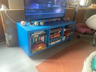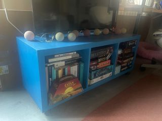 Mueble de TV Kallax de Ikea en color azul (lo pinte yo). Tambien le he puesto ruedas, asi que se puede mover con facilidad, por si hace falta. Medidas: Width: 41.5 cm Depth: 39 cm Height: 111.5 cm
