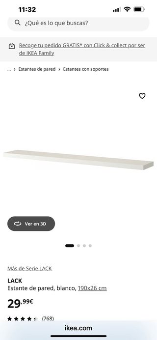 Estante de pared modelo Lack de Ikea. Su diseño minimalista se adapta a cualquier espacio. - Medidas: 190x26 cm - Color blanco - Sin estrenar, pero tiene una pequeña marca en una esquina