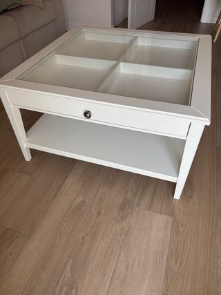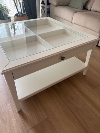 Mesa de centro modelo Liatorp de Ikea con superficie de cristal y compartimentos interiores. Se adjuntan fotos con el desgaste. - Medidas: 93x93 cm. - Acabado en blanco.