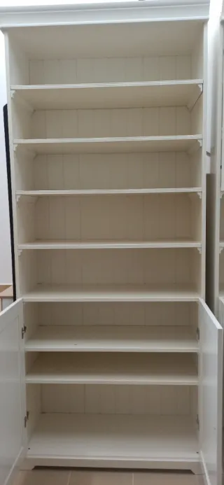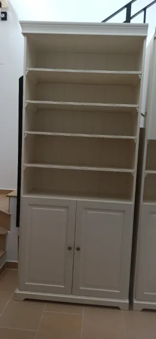 Conjunto de 2 muebles de la serie Liatorp de Ikea. Diseño clásico y elegante. - Mueble con puertas inferiores y estanterías superiores. -Mueble con puertas inferiores, balda y vitrina parte superior