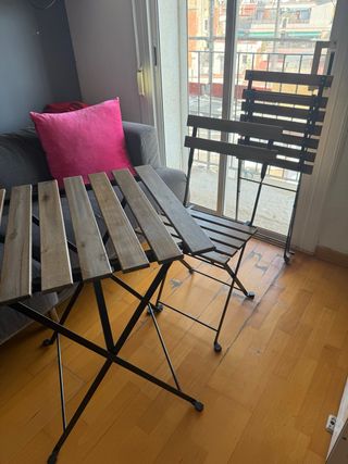 Vendo conjunto de mesa y silla plegables ideal para balcón, terraza o espacios pequeños. Muy práctico porque se pliega fácilmente y ocupa muy poco espacio cuando no se usa. Medidas: • Mesa: 55 x 54 cm, altura 70 cm • Silla: 39 x 40 cm, altura 79 cm (asiento: 39 x 28 cm, altura 45 cm) En buen estado, lista para usar. Perfecta para disfrutar de un café al aire libre o como mesa auxiliar. Ideal para balcones pequeños Fácil de guardar y transportar Se vende conjunto completo Para recoger antes del 31 de marzo.