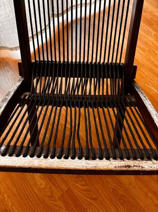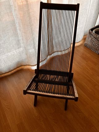 Silla de diseño para terraza o interior. - Estructura de madera oscura. - Asiento y respaldo de tiras de tela negras. COMO SE VE EN LAS FOTOS ESTA GASTADA LA MADERA POR EL SOL. Por eso el precio