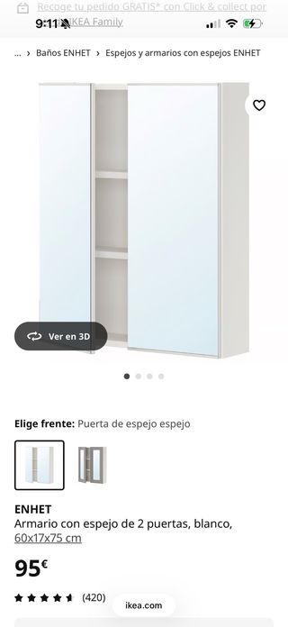 Armario de baño ENHET de IKEA con puertas de espejo. - Acabado blanco. - Medidas: 60x17x75 cm. - Dos puertas con espejo. Está sin uso, se colocó en el baño pero no daban las medidas y se retiró y guardó adecuadamente