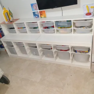 Mueble de almacenaje de la marca IKEA, con un diseño moderno y funcional. Modelo trofast Prácticamente nuevo - Color blanco. - Material de madera. Precio por cojunto de los 4!! Los pequeños de arriba de pueden colgar!! El pequeños solo 35 la unidad Grande solo 55 unidad