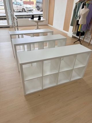 Estanterías modulares, perfectas para tiendas o vestidores. Su diseño permite adaptarlas a diferentes espacios. - Sistema de rieles para ajuste de altura. - Múltiples baldas para almacenamiento. - Base doble para mayor superficie.