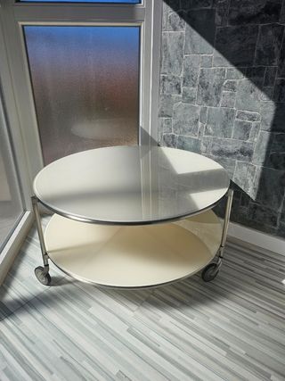 SÓLO RECOGIDA. NO ENVÍO ESTE ARTICULO. Mesa de centro redonda diseñada para Ikea por Ehlen Johansson. Diseñada con metal y vidrio color crema. Dispone de 2 alturas y ruedas para mayor comodidad. 75 cm diámetro y fondo 40 cm