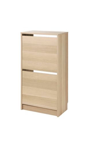Mueble zapatero de IKEA con un diseño moderno y funcional. Su acabado en madera clara aporta calidez a cualquier espacio. - Diseño de líneas rectas. - Dos compartimentos para calzado.