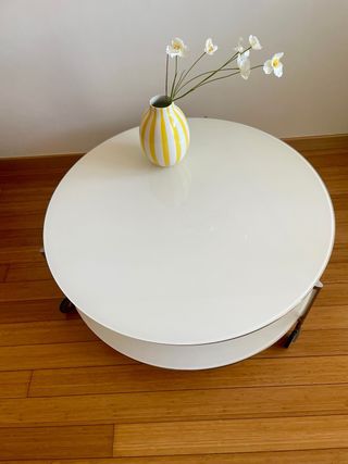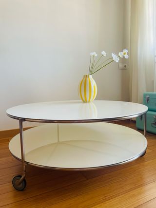 Elegante mesa de centro con un diseño moderno y funcional. Perfecta para añadir un toque de estilo a tu salón. - Tablero redondo de cristal blanco. - Estructura y patas de metal cromado. - Dos niveles para mayor espacio de almacenamiento. - Ruedas para facilitar su movilidad. - Si la miras a contraluz puede haber pequeñas e inapreciables ralla.