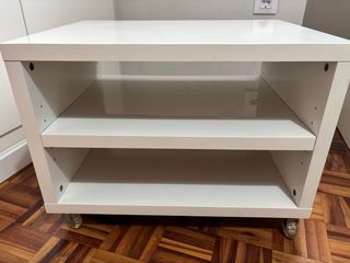 Mueble auxiliar de Ikea con un diseño moderno y práctico. - Estructura de madera lacada en blanco. - Dispone de ruedas para facilitar su movilidad. - Cuenta con dos estantes abiertos para almacenamiento. Alto: 45 cm Profundo : 45 Ancho : 61