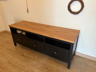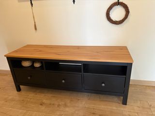 Mueble de televisión con un diseño moderno que combina madera y negro. - Encimera de madera clara. - Base y estructura en color negro. - Cuenta con cajones y compartimentos abiertos. Aspecto totalmente como nuevo.