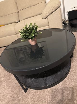 Elegante mesa de centro con diseño moderno. - Tablero superior de cristal. - Base inferior con acabado efecto mármol. - Estructura metálica resistente. -Para recoger en badalona -piso con ascensor