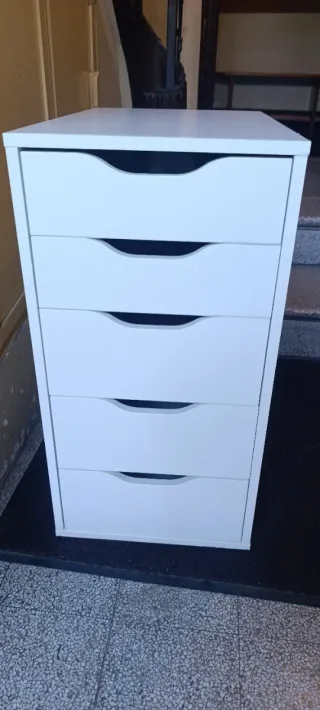 Cajonera IKEA blanca de 5 cajones. Funciona bien, los cajones abren y cierran sin problema. Tiene algunas marcas de uso como se ve en las fotos. Recogida en Badalona.