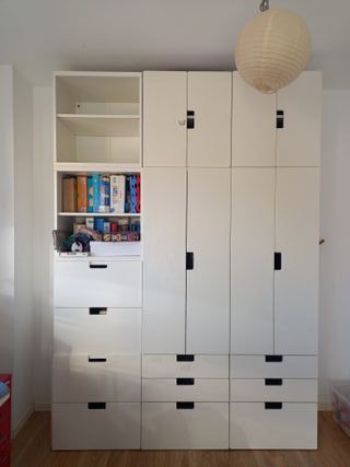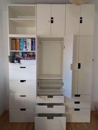 Armari infantil de la marca Ikea en color blanc. Ideal per organizar la roba i joguines. Es ven sencer o per moduls per separat. Els moduls d'armari +calaixos inferiors per 50€, els de calaixos o portes 20€ i els moduls amb prestatges per 10€.