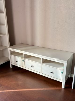 Mueble de televisión de la serie Hemnes de Ikea. Su diseño es limpio y funcional, aportando un toque nórdico a tu salón. - Tres compartimentos abiertos. - Tres cajones con tiradores. - Acabado en blanco.