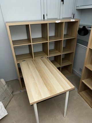 Conjunto de estantería KALLAX de IKEA con acabado en madera y una mesa plegable a juego. - Estantería modular con múltiples compartimentos. - Mesa con superficie de madera. - Ideal para organizar y optimizar espacios.
