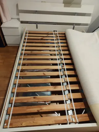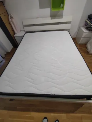 Se vende conjunto de cama de 140x200 cm Ikea MALM, con cabecero y canapé, incluyendo dos mesitas de noche MALM, colchón y topper. Semi-nuevo, tiene un año y medio de vida. Venta en persona en Moralzarzal. - Cama de matrimonio. - Mesitas de noche a juego. - Incluye colchones.