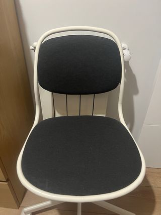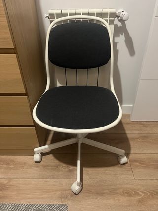Silla de oficina de Ikea en color beige y blanco. - Asiento y respaldo acolchados. - Brazos acolchados. - Base con ruedas para fácil movilidad.