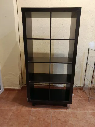 Estantería modular Kallax de IKEA con cuatro compartimentos. - Diseño moderno y funcional. - Acabado en color negro. - Ideal para organizar libros y objetos decorativos.