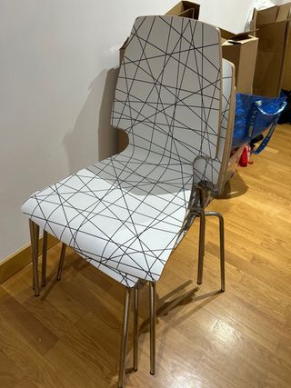 Conjunto de cuatro sillas modelo Vilmar de Ikea. Su diseño moderno y minimalista las hace perfectas para cualquier espacio. - Asiento y respaldo ergonómicos. - Patas metálicas cromadas. - Las 4 sillas tienen algún toque (ver fotos), de ahí su precio.