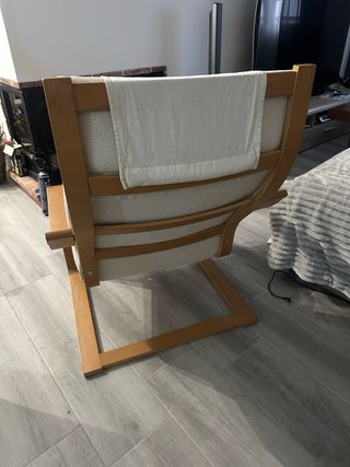 Cómodo sillón mecedora de Ikea, perfecto para relajarse. - Estructura de madera curvada. - Tapicería de tela en tono beige. - Cojín reposacabezas incluido.