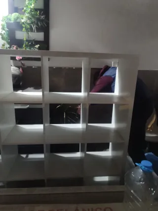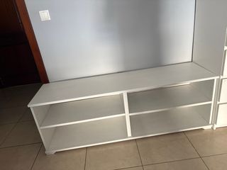 El la foto parece que el muebl esta vencido. Pero esta perfecto, solo hay que apretarlo ya que son dos modulos juntos + la madera superior. El mueble se montó miy bien y esta muy nuevo y es duro y ressistente. Mueble de salón de IKEA con un diseño moderno y funcional. - Combinación de blanco y madera. - Estructura de madera. - Compartimentos de papel.