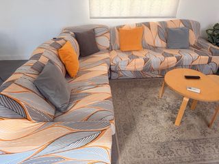 Sofá modular de 6 plazas con un diseño moderno y estampado de hojas. - Tapicería de tela. - Combinación de colores gris y naranja.