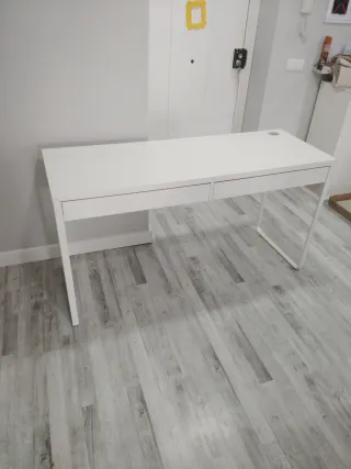 Mesa de escritorio MICKE de IKEA en color blanco. Un diseño moderno y funcional para tu espacio de trabajo. - Dos cajones integrados para almacenamiento. - Orificio para pasar cables. -Informacion sobre las medidas en las fotos
