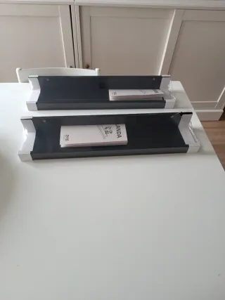 Se venden dos estantes para cuadros de Ikea. Son ideales para exhibir tus fotos y recuerdos. - Color negro y blanco. - Fabricados en metal y plástico.