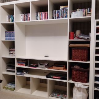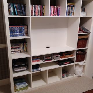 Mueble de salón modular de Ikea, ideal para organizar tu espacio y colocar televisión. - Estructura blanca. - Amplio espacio de almacenamiento. - Incluye compartimentos para libros, DVDs y juegos. - Se pueden ver títulos como TEMPLO DEL SOL, LA ISLA NEGRA, LA GREJA ROTA, STOCKH COQUE, SCRABBLE.