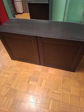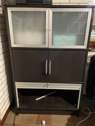 Mueble de oficina de la serie Effektiv de Ikea. Combina almacenamiento cerrado y abierto. - Puertas superiores con acabado de cristal y metal. - Compartimento inferior con persiana enrollable y cerradura. - Estructura de madera oscura. Tiene marcas de uso pero esta en buen estado general. 135 alto 84 ancho 43 fondo Tengo 2 - el segundo esta en uso pero se puede negociar ambos - negociable