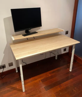 Práctico mueble para elevar tu monitor y organizar tu espacio de trabajo. - Diseño moderno en blanco y madera. - Cuenta con dos cajones para almacenamiento. - Superficie lisa y fácil de limpiar. Precio no negociable