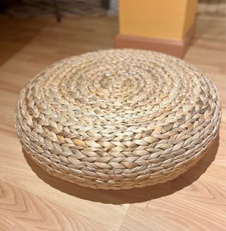 Puf redondo de estilo natural, perfecto para añadir un toque acogedor a cualquier espacio. Prácticamente nuevo, no se ha usado. - Diseño tejido a mano. - Tonos tierra que combinan fácilmente.