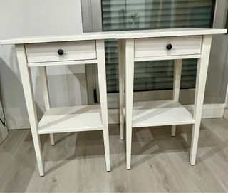 Se venden dos mesitas de noche, de color blanco, de la serie Hermes de Ikea. Compradas en verano de 2025, están como nuevas. - Incluye un cajón con tirador negro. - Estante inferior para almacenamiento adicional.