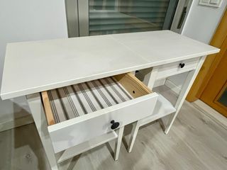 Escritorio moderno de Ikea con un diseño limpio y funcional. Ideal para cualquier espacio. - Superficie amplia y lisa. - Dos cajones integrados para almacenamiento. - Orificio pasacables en la superficie.
