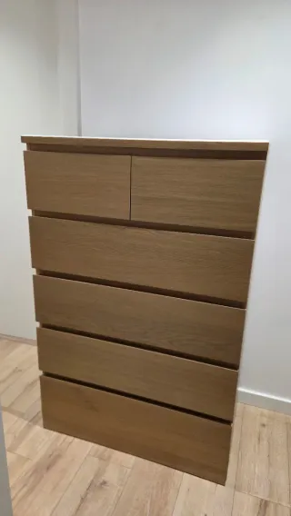 Cómoda de seis cajones de Ikea, modelo Malm. Su diseño moderno y funcional se adapta a cualquier habitación. - Acabado en madera de roble. - Seis cajones amplios para almacenamiento.