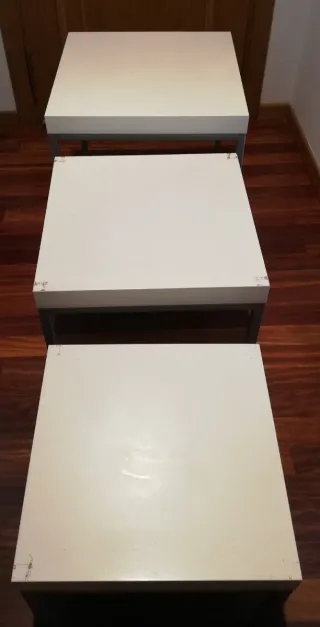 Conjunto de tres mesas auxiliares de diseño moderno. - Estructura robusta. - Superficie lisa y fácil de limpiar. - Apilables para ahorrar espacio.