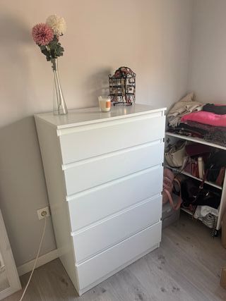 Práctica cajonera de Ikea con un diseño moderno y funcional. - Estructura principal en color blanco. - Cajones con acabado en madera. - Ideal para organizar tus pertenencias.
