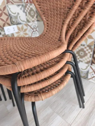 4 Sillas de diseño moderno con estructura de metal y asiento de mimbre. - Patas metálicas negras. - Asiento tejido en mimbre marrón.