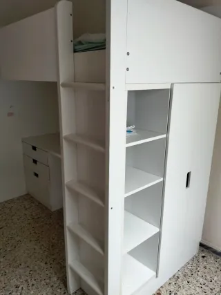 Mueble modular de Ikea, ideal para habitaciones juveniles o de estudio. Combina almacenamiento y zona de trabajo. - Estructura de madera. - Color blanco. - Incluye escritorio y armario.