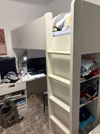 Vendo litera de madera color blanco, ideal para habitación infantil o juvenil. Diseño moderno, resistente y muy funcional. 🛏 Incluye: • 2 colchones (costaron 139€ cada uno) • 2 juegos de fundas de corazones de IKEA 📌 Estado: • Comprada hace menos de 1 año • Muy poco uso • En perfecto estado general • Tiene pequeñas marcas estéticas que se pueden retocar fácilmente y no afectan en nada al uso 👉 Se vende todo junto. Muy buena oportunidad, prácticamente nueva por mucho menos de su precio original.