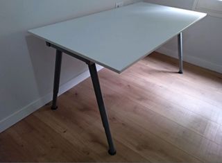 Escritorio de Ikea con superficie blanca y patas metálicas. - Medidas: 160x80 cm. - Diseño moderno y funcional. - altura regulable entre 60-90 cm