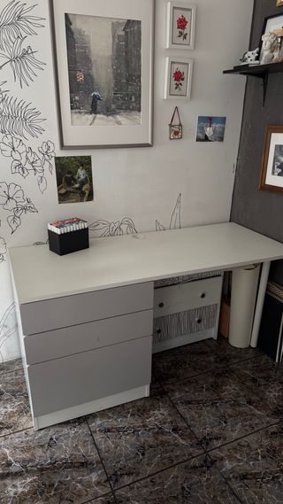 Escritorio de Ikea con un diseño moderno y funcional. Sus acabados combinan el gris y el blanco para adaptarse a cualquier espacio. - Cajonera integrada con tres cajones. - Compartimento adicional con puerta. - Superficie amplia para trabajar o estudiar.