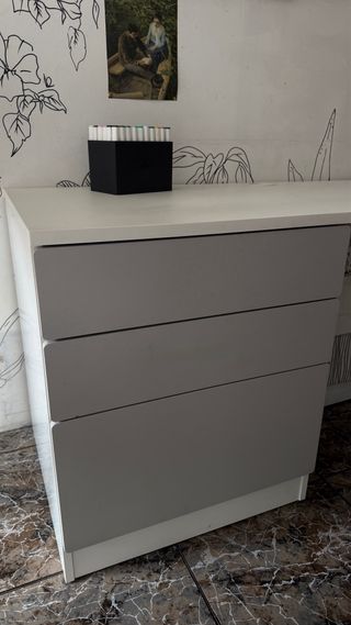 Cómoda de tres cajones de Ikea. Un mueble práctico y funcional para organizar tus pertenencias. - Diseño moderno y limpio. - Acabado en madera.