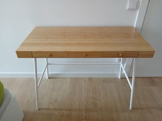 Escriptori amb la superfície de bambú. - Potes metàl.liques blanques - Tres calaixos integrats