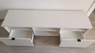 Mueble de televisión de IKEA con un diseño moderno y funcional. Combina acabados en blanco y detalles en mimbre. - Estructura principal en blanco. - Amplio espacio de almacenamiento.