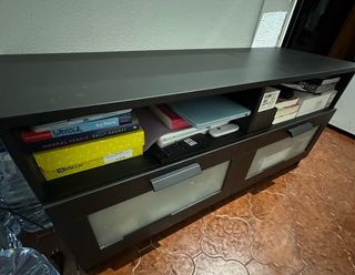 Mueble de televisión de Ikea, modelo Brimnes en color negro. Cuenta con espacio de almacenamiento y puertas de cristal. - Diseño moderno y funcional. - Puertas con tiradores metálicos. - Estantes interiores para organizar. - Patas para elevar el mueble del suelo. Tamaño: 120*41*53 No hago envíos, se debe recoger por Mataró. Esta usado y tiene algunas marcas pero los cajones están intactos y esta todo perfecto.
