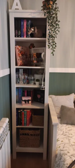 Diván Hemnes de Ikea. Alguna esquina rozada. Se puede disimular con un poco de pintura blanco lino. Colchón de 80*200*13 Estantería 196*49*34. Tiene un poco rozado en la balda de abajo de mover el cesto. Disponible aparte cómoda de tres cajones.