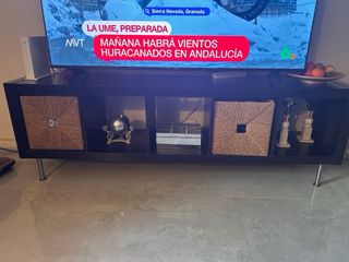 Mueble de TV de Ikea con un diseño moderno y funcional. Combina a la perfección con cualquier estilo de decoración. - Estructura principal en madera. - Puertas con detalles en cristal. - Amplio espacio de almacenamiento.